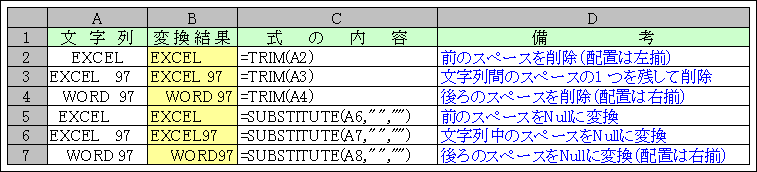 "(スペース)、置換文字列を""(Null)にすることにより、文字列中のスペースを取り除くことができる。また文字列の前後のスペースと文字列中の単語間のスペースを1つだけ残してスペースを除去するときは、TRIM関数を使用する。