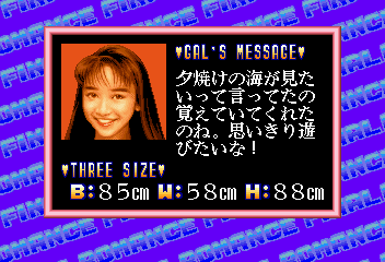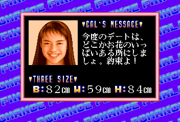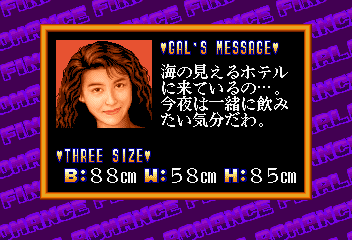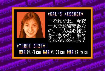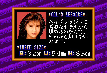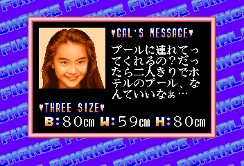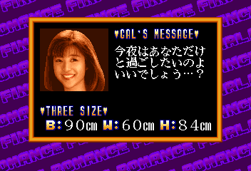 アイドル麻雀ファイナルロマンス・・・・脱衣麻雀の定番である当時の人気アイドルのそっくりさん?が出演。 美しいグラフィックなどさすがビデオシステムと感心してしまう。 ただメインの麻雀に関しては、CPUのイカサマがひどく難易度は高い。 しかしそれでもその美しいグラフィックを見たいがために、コンティニューしている俺がいる。(^^;