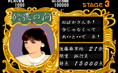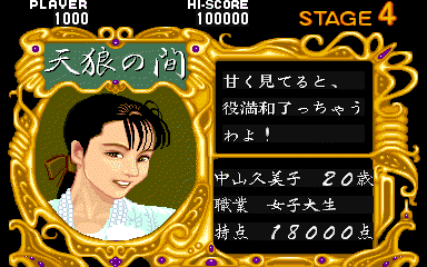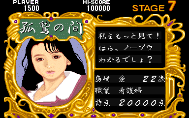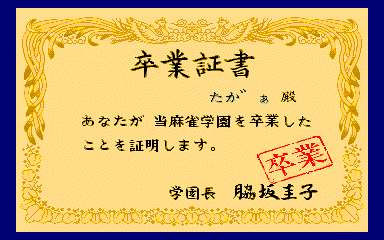 麻雀学園卒業編・・・・当時よく喫茶店でやっていた麻雀ゲームだが、今回久しぶりにやるとかなり新鮮だった。 というのは、面クリアー後のいたずらだが、かなり生々しく今では完全に問題になりそうなものが多く、それが新鮮に感じてしまった。(^^; ゲームとしてはよくあるイカサマ麻雀ゲームだが、たしかこのゲームがはじめて麻雀でボタン連打を取り入れたと思う。 ナイスアイデア!