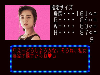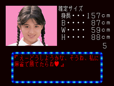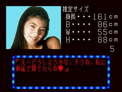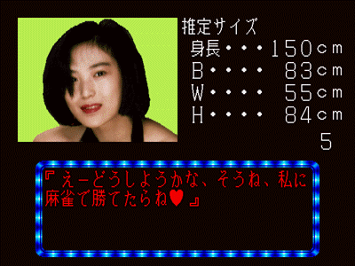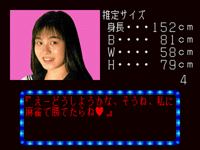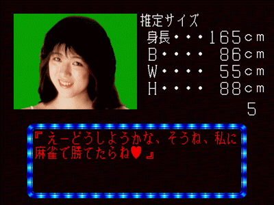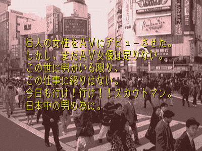 麻雀スカウトマンー潜入!!AV撮影現場ー・・・・AV女優が出演している麻雀ゲーム。(出演している女優は誰も知らないが・・・。) タイトルどうり、町で歩いている女の子に声をかけてスカウトする。 サブタイトルに気をひかれてやってみたが、特に変わったところは無く普通の脱衣麻雀ゲームでした。(男優との絡みシーンなどを期待していた。(^^;)
