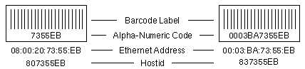 バーコードラベルの上の英数字コードは置換部品をプログラムするために使われます。 08:00:20でスタートの Mac アドレスのコードは12桁のアドレスの最後の6