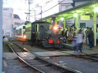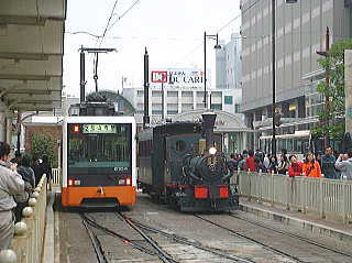 松山市駅前にて最新鋭の低床電車と並ぶ坊ちゃん列車。