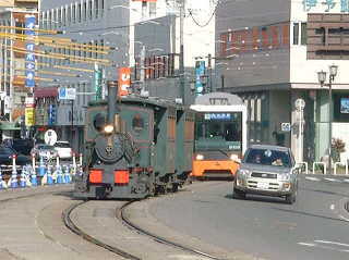 続行の低床電車を従え、道後温泉を出発する坊ちゃん列車。