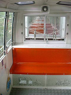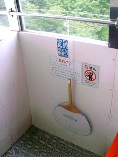 こういうものが装備されています。 エアコンなんてものはないので、みんなこれを使って 「パタパタパタ・・・」 次回増備車の時はぜひともエアコンをお願いしたい 所です。 |