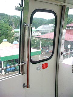 園内を周回する「スカイビュートレイン」 こちらはホーム側なのでドアがたくさんついています。 |