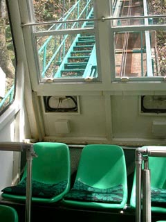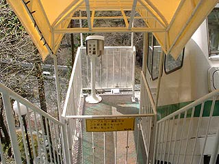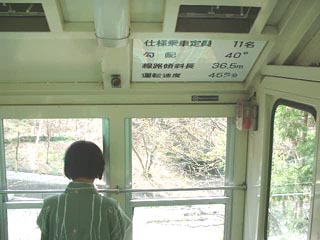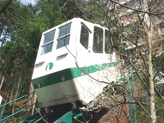林の間を行くケーブルカー。 結構気持ち良いものなのです。 座席の乗客の皆さんはどうしても山下側を眺める形と なるのです。 |
