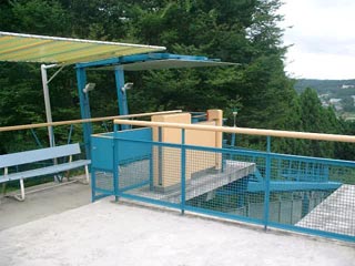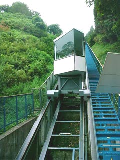 これが「シャトルエレベータ」なるからくりでござる。 かなり利用者も多い様子。 城跡の「お丸山公園」への近道でござる。 |