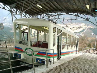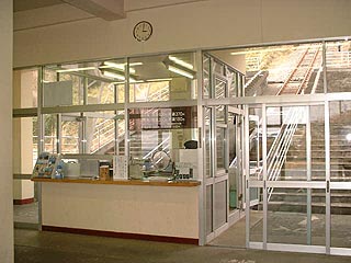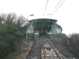 おお、降りてまいりました。 係員の人が乗車しているのが判りますが、 特に操作をする訳ではないのは他と一緒です。 ケーブルカーの駅って、なんか秘密基地風ですね。 |