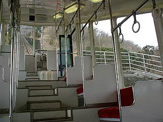 この車内はなぜかロングシートで、 吊革がならんでいます。 角度が急になるので、クロスシートだと山下向きの 人が窮屈な姿勢になるためなんじゃないか? と思いますが、それならみんな上向きにすれば いいんだよなあ・・・なぜだろう? |