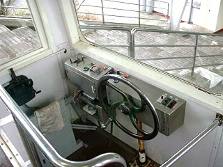 こちらが運転席(というか・・・?)です。 大きなハンドルが目を引きます。 これはハンドブレーキで、車のサイドブレーキ みたいな役目をするやつです。 運行が終わって止めて置くときとかに使うのかな? 運行中使う所は見たくありましぇん。 それは非常事態です。 (その前に非常ブレーキがあるか・・・) |