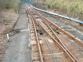 本にも載っていた「強力なライト」 このあたりしばしば霧が発生いたします。 運転手が乗る訳じゃないんですが、 ケーブルカーの進行する方向に作業員の人などが いるとき、注意を促すのに必要なのです。 ケーブルカーの保線って、車両を止めてやると 思うのですが・・規則なんですかねえ?? |