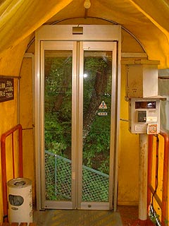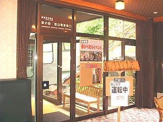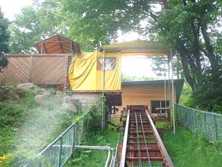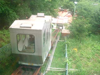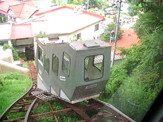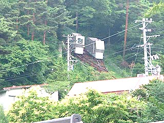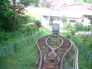 ここのすごい所は「交走式」である点。 途中ですれ違います。 旅館や展望台の私設ケーブルカーの多くは つるべ式(単走式)で一両の物ですが、 ここはそういう意味では本格的です。 |