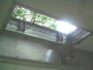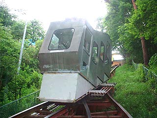 ケーブルカーの屋根上には天窓が二カ所付いています。 車体そのものは簡素で鉄道車両らしくありませんが、 初めて見ると強烈な印象です。 |