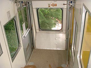車内を上から眺めた様子。 車両側のドアは手動です。 山下側窓の上にあるのは「発車ボタン」。 完全自動制御で運転されます。 タイムボカン派は「ポチッとな」の点呼(?) を忘れずに(爆) |