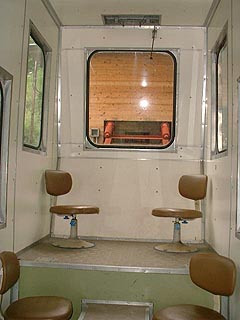 車内を下側から。 椅子は六脚が階段状に装備されています。 一人掛け回転クロスシートです。 昔の「こだま」の特別二等車みたい(爆) 前後とも窓は一枚。 ドアは山下側両サイドに一つずつあります。 |
