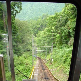 町のある高野山駅は山上にあります。 この為線路は下に向かって伸びております。 深い森の中に降りていく感じですね。 |