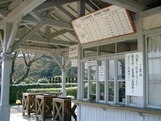 これが「明治村名古屋駅」だ。 名古屋にしては設備が小さくて、なんかローカル線の 駅を思わせるのであります。 でもいい雰囲気。映画のロケに、絵を描く際の参考 資料に、いかがでしょう? |