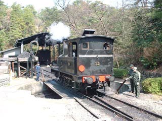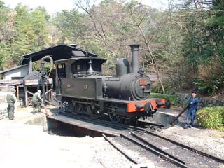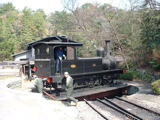 本日の機関車は12号。 英国はシャープ・スチュワート社の生まれ。 明治時代には新橋−横浜間を走っていました。 (当時は165型)。 到着したら向きを変えなければなりません。 いや、バック走行もいけるのですがそこは博物館、 ここまでやってみせるのです。 |