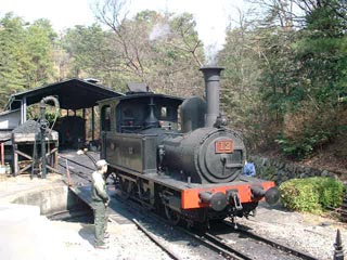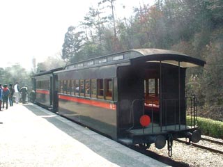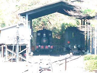 機関庫(?)の内部。 もう一両の9号はアメリカのボールドウィン生まれ。 明治から戦前までの私鉄で多く使われたタイプ。 この車両は現在のJR身延線ができた頃、 使われていたものです。 当時は私鉄だったのです。 また、予備の客車も入っていました。 ラッシュ時(?)は3両編成で走ります。 |