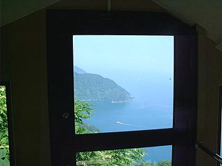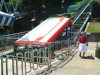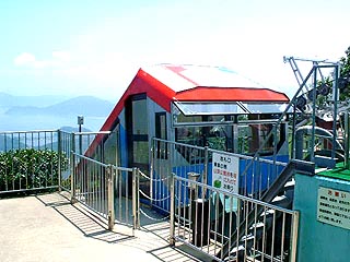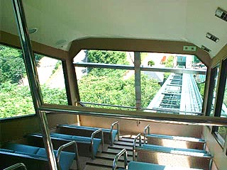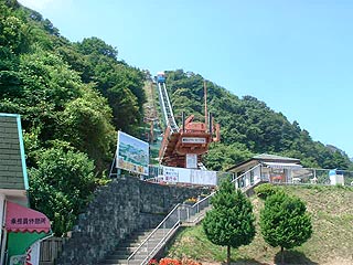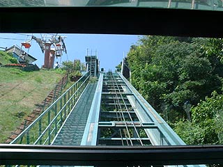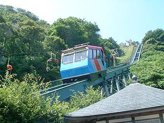 山上駅(?)に停車中。 切符は必ず往復になりますが、 帰りにここで回収されてしまいます。 余談ですが、ここで発車を待つ間怖いのなんの。 角度が傾斜と合っていないのです。 リフトの方が恐怖感はありません。 |