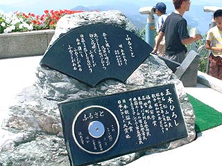 これが五木ひろしの歌碑(というのか?) 下のヤツはメカが仕込んであって、触れると 「ふるさと」が流れる・・・ハズなんだけどなあ?? この時は故障中でした。 |