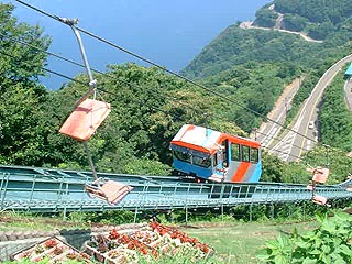 梅丈岳山頂の駐車場から眺める。 ケーブルカーとリフトが併設されています。 運賃は同じ。お好きな方へどうぞ。 |