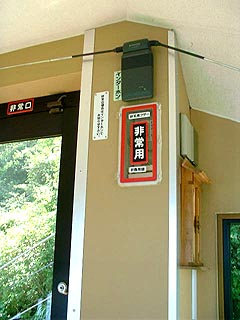 車内には非常用の通話装置などがありました。 注目は右側。壁に神棚のようなものが・・・ お守りやお札は良くあるのですが、ここまでやるとは。 |