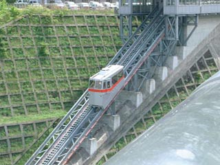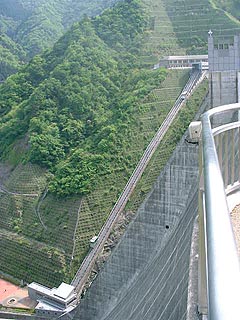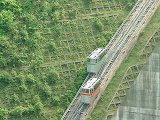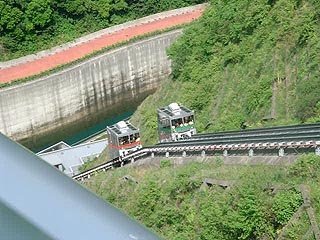 うへ〜〜!! いきなり驚いたぜベイビー!! ダムの真横の斜面にへばりついているヤツ。 これがうわさの(?)インクラインだ! 全長216m、高低差121m、最大傾斜角35°。 どうして鉄道として認められていないのか 全く不思議な乗り物だぜ。 |