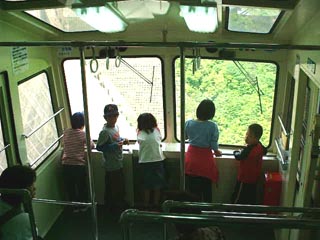 なんとここは完全な複線なんだぜ! 普通のケーブルカーは単線なんだけどな。 赤が1号、緑が2号らしいぜ。 二台とも銀のボディが決まってるよな。 (その後元東京索道の方よりメールがあり、アルミでなくステンレスとのご指摘をいただきました) |