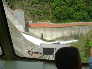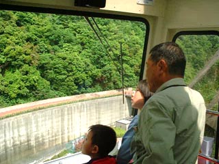 山頂停車場(しかし切符には「ダム上」と記載) の近くで。 結構この構造物、SFマニアにも受け入れられるよな。 車体も結構変わった形だぜ。 |
