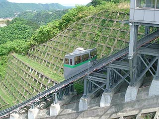 うっへ〜〜、でかすぎ〜!! 思わずのけぞっちまったぜ。 完全に笑い物と化しているぜ。 ちなみに左にあるのがインクラインの山麓停車場。 二階から発車しているぜ。 |