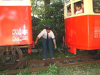 到着の度に連結作業が行われます。 運行に関わっておられる人数も少なく、 作業に大わらわでした。 |