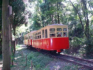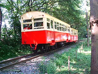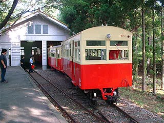 森の中を抜ける2両編成。 現役当時もこのような編成があった事でしょう。 |