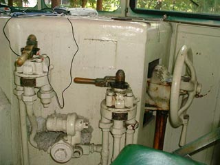 一番右の丸いハンドルはハンドブレーキ。 真ん中はおそらくエアブレーキ。 左は前後進切り替えハンドル? |