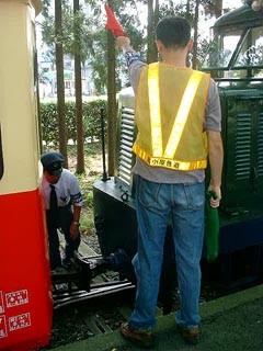 運転前の打ち合わせ。 今度は動力車2両を使用しての続行運転 となるので、運転も大変です。 |