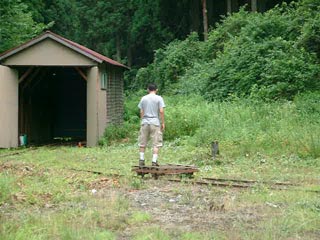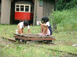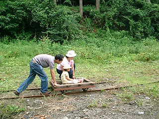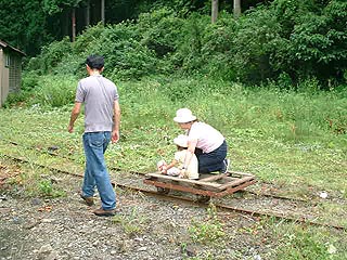 小型トロッコは大活躍でした。 車庫に向かって下り坂になっている為、 行きは押しですが、帰りは勝手に走ります。 |