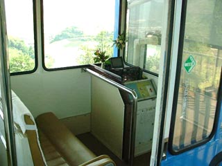 右側に見えているのが操作卓。 横向きになって運転します。 ドアは片側にしかありましぇん。 |