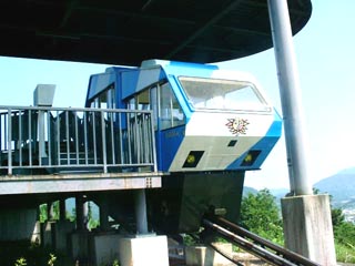 ここに見えるギザギザに車両についた歯車を かみ合わせて進みます。 モノレールとは言っても実際には上下二段に分かれて いるのが判ります。 このような機構の為、車両の速度は4.3km/h 程だそうです。 観光用にはかえって好都合ですね。 |