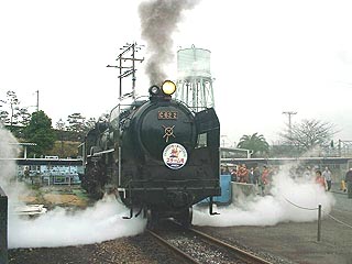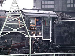 C622号機、ついに走り出しました。 バックの給水塔がいい感じ。 なにしろ本当の機関区の中ですから。 見ていたアベックの女のほうが「スリーナインみたい」 と言いましたが、男は無言。 男だったら教えてやれ・・ いや、やたら喋るヤツは持てないのかな? |