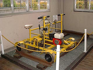 やっぱりこういうもので締めくくりましょう(笑) 保線区の巡察用に使われる小型モーターカーで、 自転車のように漕ぐ事もできます。 しかしちゃんと保存されているのは何台あるのでしょう? これは幸福な一台なのです。 |